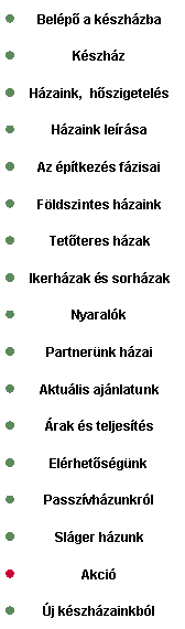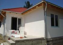 és még más is..... Eddig is reális árak: Áraink az évek alatt mindvégig reálisak és korrektek voltak. Az akciónk nem elvtelen spórolást vagy értékcsökkent házat jelent, hanem jobb gazdálkodást, jobb szervezést. 1. Vastagabb hőszigetelés Egyrészt már az árengedménynek tekinthető, hogy áremelés nélkül felemeltük a szigetelés vastagságát 23 cm-re. 2. Egy évig bemutató ház Másrészt olyan módon tudunk árengedményt adni, ha a tulajdonos vállalja például azt a kellemetlenséget, hogy az átadást követően egy éven át megmutatja házát érdeklődőknek, természetesen előre egyeztetett időpontban. - 2 % 3. Előre kalkulálható gyártási időpontban Kedvezmény érhető el azáltal, ha gyártási időpontot előre tudjuk kalkulálni. - 1 % 4. Típus ház megrendelés További kedvezmény adható olyan házunkra amelyeket megépítettünk, amelynek naprakész anyagkiírása és gyártási rajzai vannak. Pld. a jobb oldali képsoron a Sláger 98 nevű házunk. - 1 % 5. Ingyenes tervezés Egyértelmű kedvezmény évek óta. 6. Alapozás saját kivitelezésben Kedvezményt jelent az, ha valaki az alapozást saját szervezésben a családja segítségével elvégzi. Például, hogy az alapozást ne kelljen sem velünk sem egyéb más céggel végeztetni, az alapozáshoz a gyártási rajznak és a statikának megfelelő kiviteli rajzot adunk. Azért, hogy az alapozás kifogástalan legyen ingyenesen biztosítjuk az építésvezetést. 7. Szelemenes tetőszerkezet a rácsostartó helyett Amikor kedvezményről beszélünk további figyelembe veendő dolgok vannak. Itt mindjárt a jobb oldalon látható tetőszerkezet. Masszív szelemenes és robosztus tető tartozik az alapárba, és nem a korlátozott funkciójú de olcsóbb rácsostartó. 8. Masszív mennyezetborítás a fóliaborítás helyett A mellékelt fotón látható a masszív mennyezetborítás 23 cm-es hőszigeteléssel a földszintes házakon. A födém 20-as gerendákkal készül és terhelhető. Ezáltal magasabb és elegánsabb ház lesz, mivel a födémen túl még a körben futó talpszelemen is emeli a házat. 9. Tetőteres házaknál 20 cm-es szarufák Tetőteres házaknál az általánosan elterjedt 15 cm-es helyett 20 cm-es szarufákkal készítjük a tetőt a fokozott szigetelés miatt. A hőszigetelés teljes vastagsága itt is 23 cm.