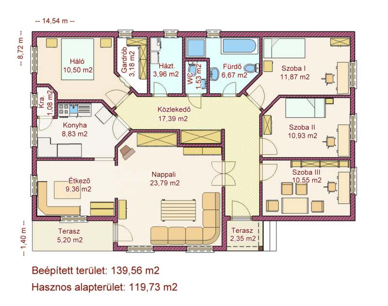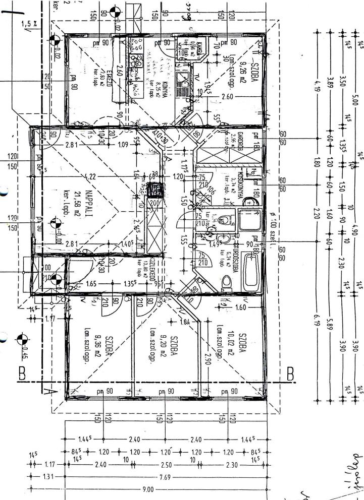 | A ház hasznos alapterülete nagyobb mint 100 m2. Nagycsaládosoknak javasolható, 4-5 főnek kényelmes otthont biztosít. Az építész rajzon levő falvastagság nem mérvadó, a ház vastagabb falakkal készült. A most készülő normál házaink szigetelésének vastagsága 23 cm! Lent az eredeti építész alaprajz. |