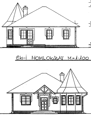 Fent a homlokzati rajzok, jobb oldalon hasonló házakról montázs |
