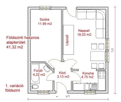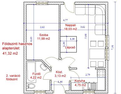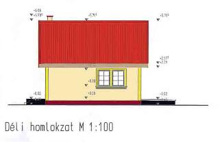 Kis alapterületű könnyűszerkezetes családi ház nyugdíjasoknak vagy fiataloknak, fészekrakóknak. A ház tetőtere is kiépült, így a földszinti 39,9m2 alapterülethez 26m2 tetőtér is tartozik. Feljáró a nappali bejáratától balra, az ajtótól 15 cm távolságról indul. A falvastagságok az új falaink szerint. Az épület külső méretei 7 x 6,5 m.