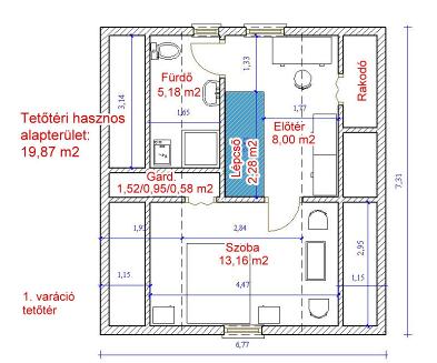 | A két változat között a tetőtérben van különbség. A tetőtéri alaprajz a lépcső típusához lett alakítva a jobb helykihasználás miatt. A második variációban a zuhanyzó kikerült az épület külső síkjához, így a tetőt egy ablakházzal /gaubeval/ meg kell emelni a fürdőnél, a feljárónak csigalépcső alkalmazható. |